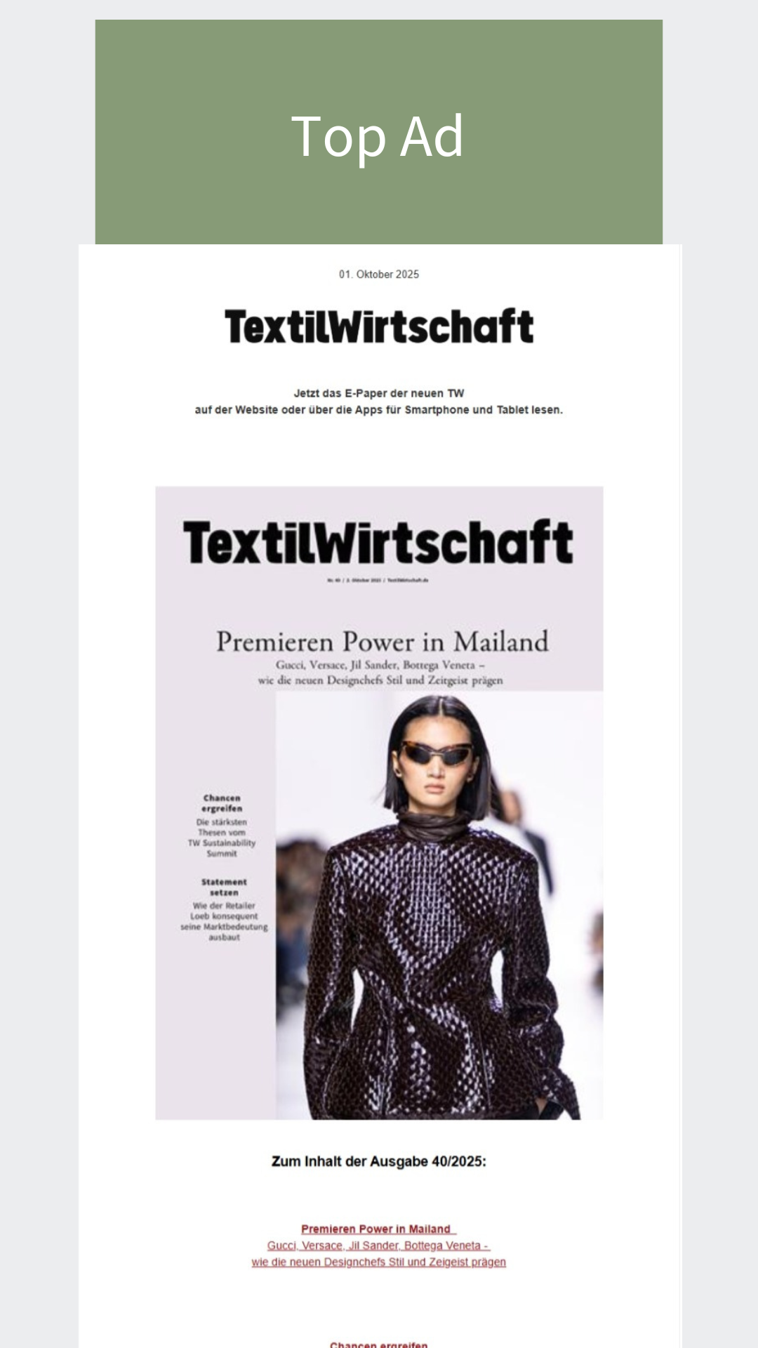 - Deadline for data delivery: Wednesday of the previous week to banner@textilwirtschaft.de