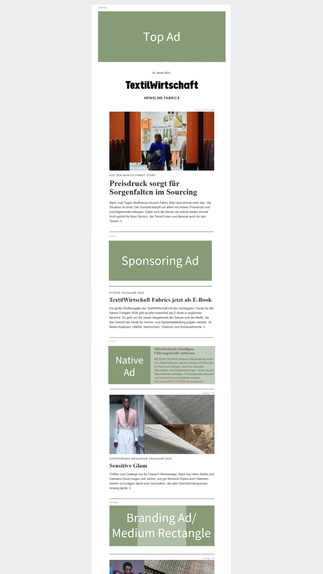 Branding ad II (520 x 200 px) / Medium rectangle II (300 x 250 px) € 1,300 / season (equals 2 newsletter sendouts)